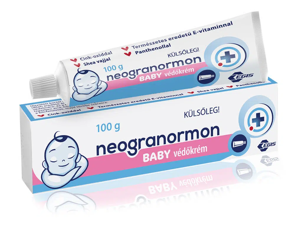A Neogranormon Baby védőkrém gyengéden ápolja, nyugtatja és regenerálja a pelenkával fedett érzékeny bőrfelületet. Mindennapos használata során védőréteget képez a babapopsin, ami megvédi a pelenkán belüli nedvesség irritáló hatásától és a kipirosodástól.